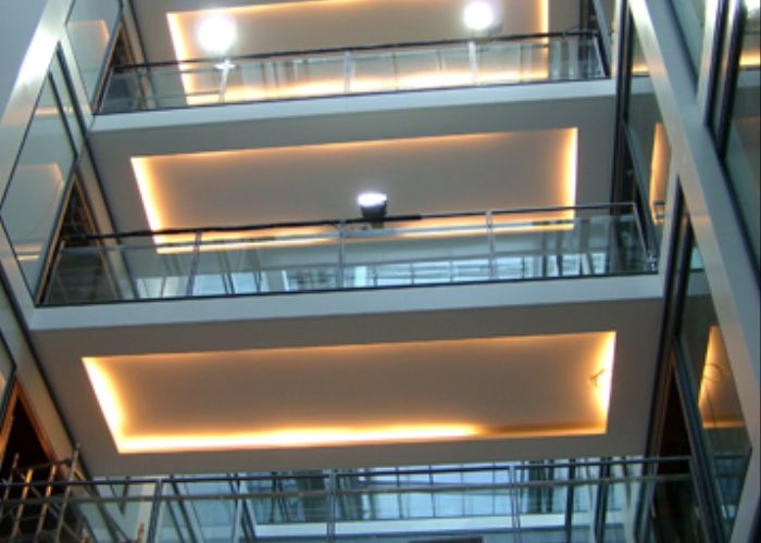 This refurbished office building consists of 450m2 of atrium roof and 3800m2 of atrium frameless glass. The level of skilled labour on this project peaked at 20 operatives.